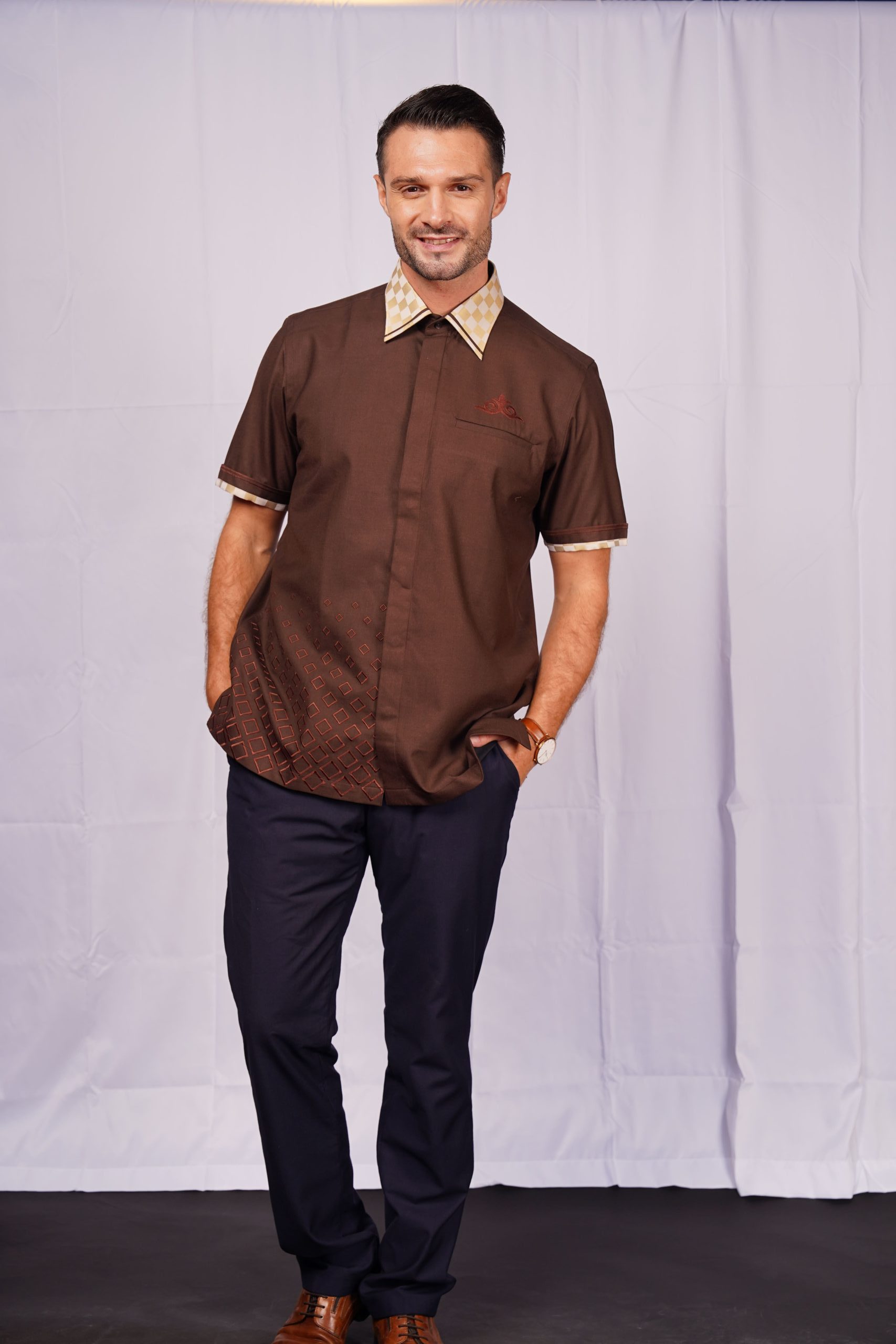 Shirt in woven fabric with an easy-iron finish. Turn-down collar, classic front and darts and darts and a yoke at the back. Short sleeves. Gently rounded hem. Slim Fit with narrow shoulders and a tapered waist for a fitted silhouette. Added Swarovski stone.